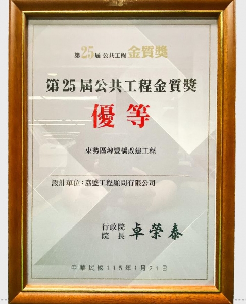 東勢區埤豐橋改建工程獲得「第25屆公共工程金質獎-優等」
